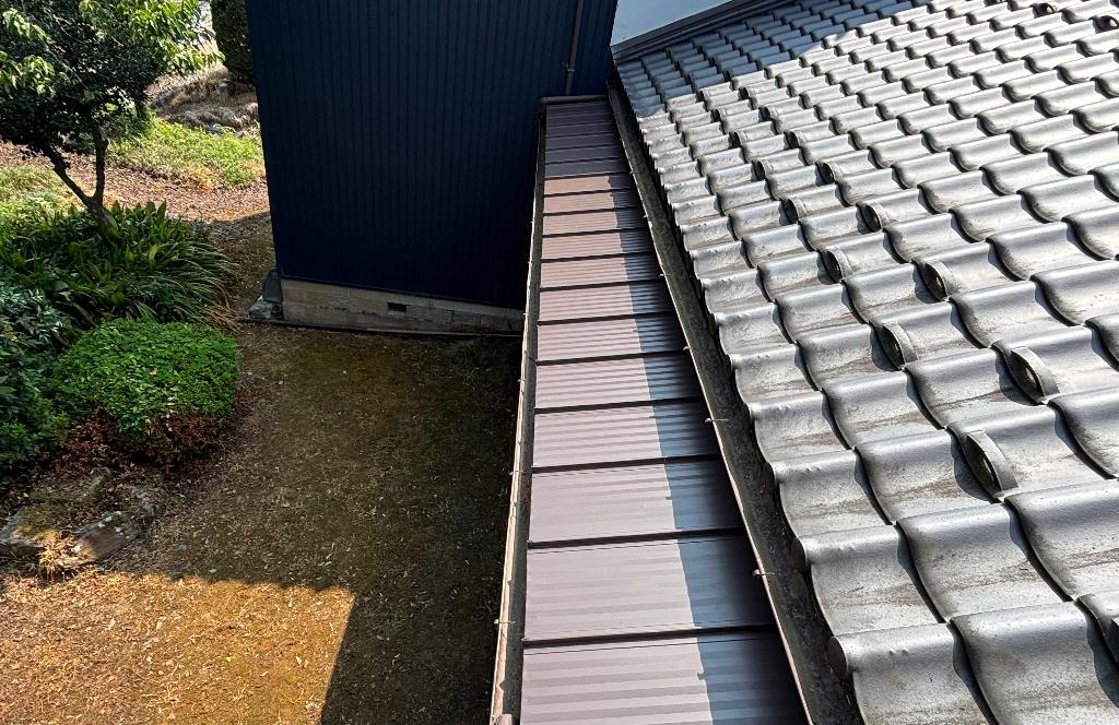 工事前後の写真です。古くなった板金屋根を、アーリールーフ(板金)に張り替えしました。